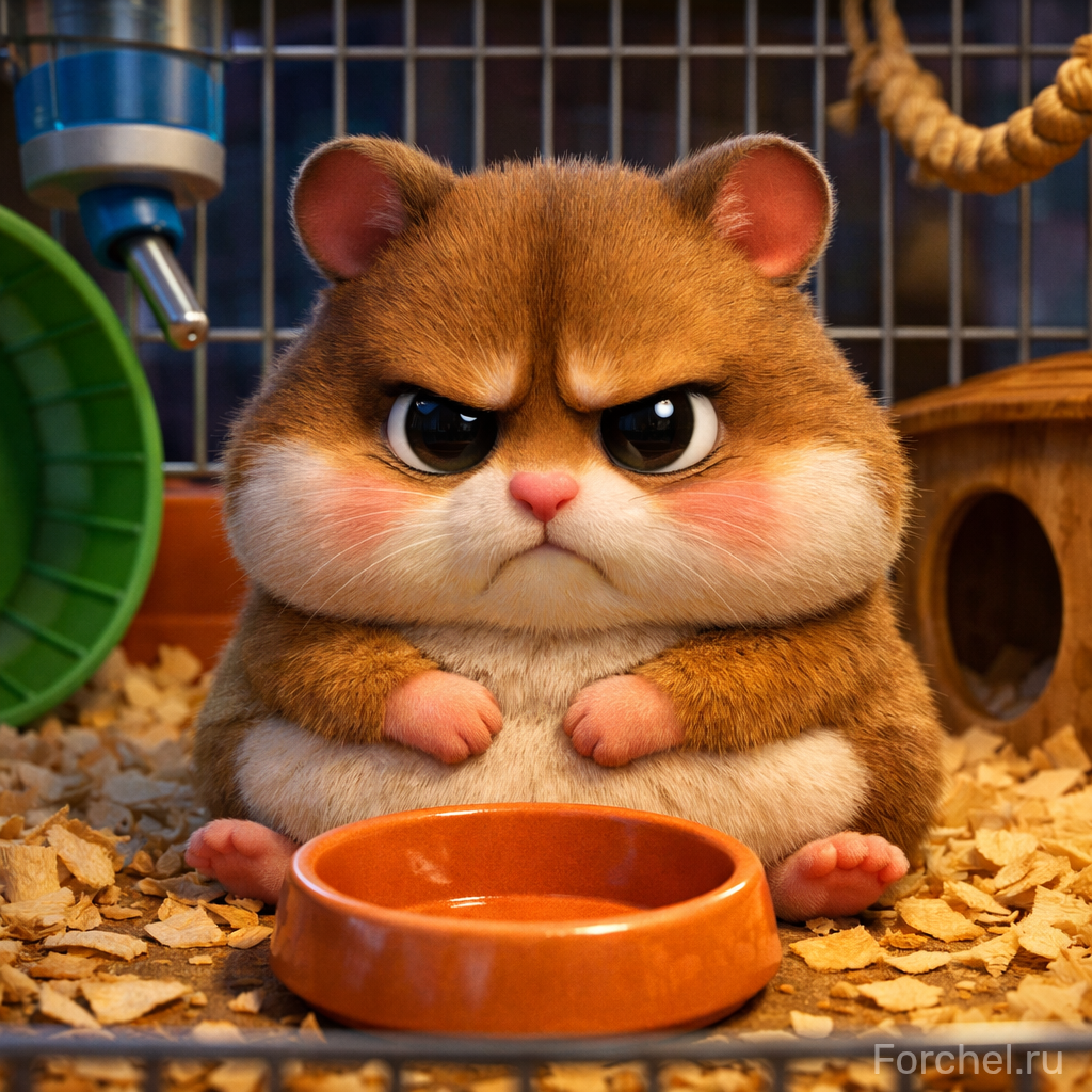 — Ах, Хомочка, прости меня! Больше никогда тебя не забуду кормить и чистить клетку!