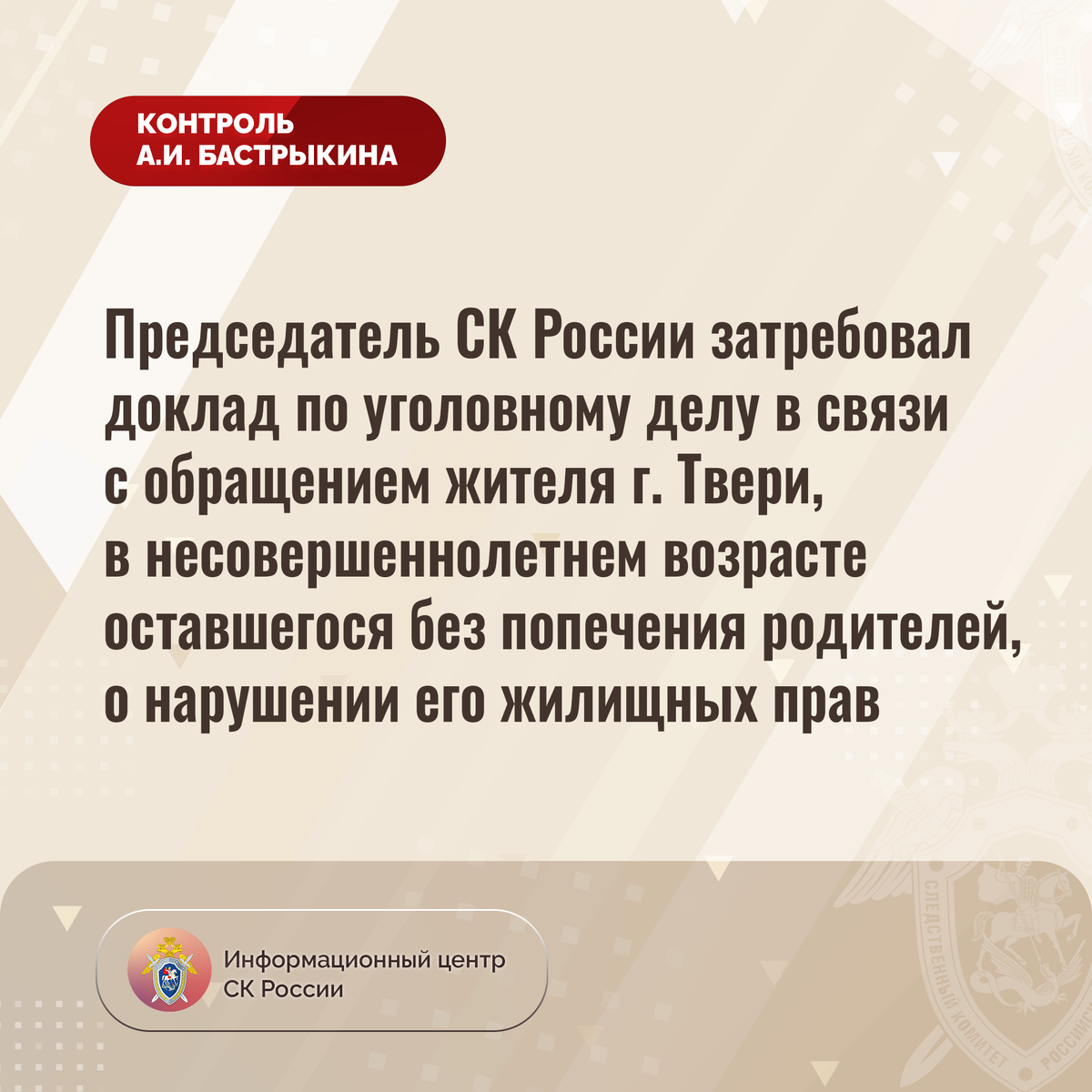 Председатель СК России затребовал доклад по уголовному делу в связи с обращением жителя г. Твери, в несовершеннолетнем возрасте оставшегося без попечения родителей, о нарушении его жилищных прав В приёмную Председателя СК России А.И. Бастрыкина в социальной сети «ВКонтакте» обратился житель города Твери, в несовершеннолетнем возрасте оставшийся без попечения родителей, по вопросу длительного непредоставления ему положенного по закону жилья. С 2020 года молодой человек состоит на учете лиц, подлежащих обеспечению жилыми помещениями. Несмотря на судебное решение, до настоящего времени мер к реализации его прав не принято. Отмечается, что в аналогичной ситуации оказалась сестра заявителя. Многочисленные обращения в различные инстанции результатов не принесли. В СУ СК России по Тверской области возбуждено уголовное дело. Председатель Следственного комитета Российской Федерации Александр Иванович Бастрыкин затребовал у руководителя СУ СК России по Тверской области Альберта Андреевича Кизим