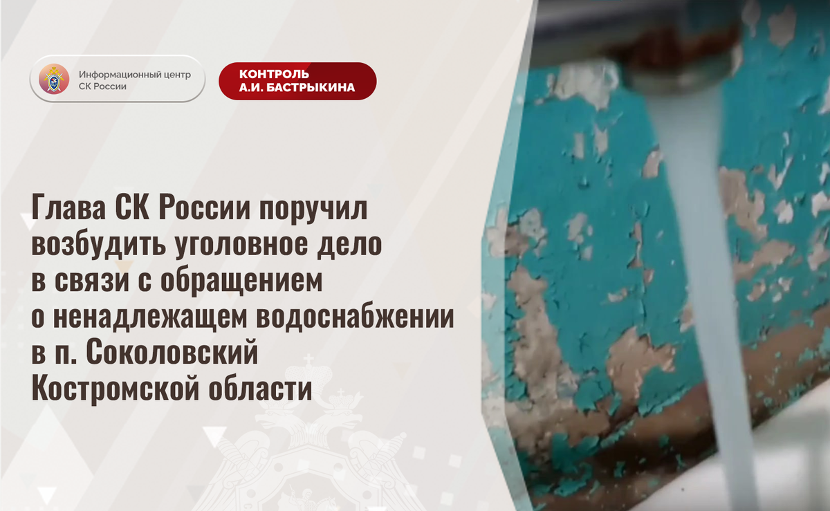 Глава СК России поручил возбудить уголовное дело в связи с обращением о ненадлежащем водоснабжении в п. Соколовский Костромской области В комментариях в социальной сети СК России поступило обращение по вопросу нарушения прав жителей поселка Соколовский Костромской области на качественное водоснабжение. Длительное время в жилые помещения подается жизненно необходимый коммунальный ресурс, непригодный для потребления и бытовых нужд в связи с превышением предельно допустимой концентрации вредных веществ и осадков. Обращения граждан в компетентные органы результатов не принесли. В СУ СК России по Костромской области организована процессуальная проверка. Председатель Следственного комитета Российской Федерации Александр Иванович Бастрыкин поручил руководителю СУ СК России по Костромской области Денису Николаевичу Левченко возбудить уголовное дело и представить доклад о предварительных и окончательных результатах его расследования. Исполнение поручения поставлено на контроль в центральном ап