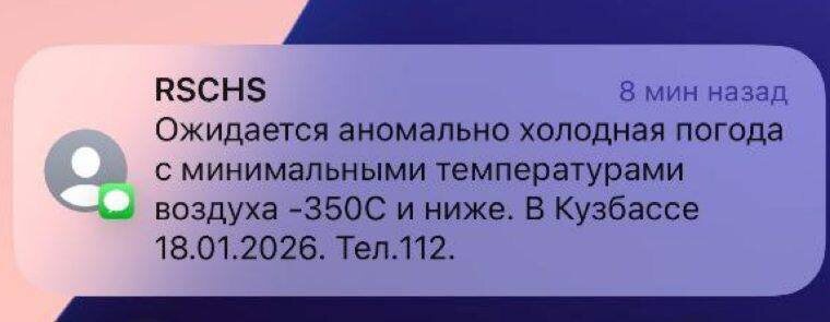 Жители Кузбасса получили предупреждение о резком похолодании до температуры минус 350 градусов Цельсия, что оказалось технической ошибкой системы информирования населения.