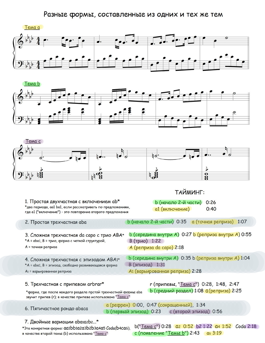 Для более легкого освоения музыкальных форм можно использовать различные формы, основанные на одних и тех же темах, что позволит сфокусировать внимание именно на расположении тем в композиции и сделает специфику различных форм более наглядной. Также звучание одних и тех же тем позволит легче воспринимать формы на слух. В примерах использован стиль периода расцвета романтизма (Шуман, Лист). Названия и трактовки могут существенно различаться у различных авторов и в различных школах.