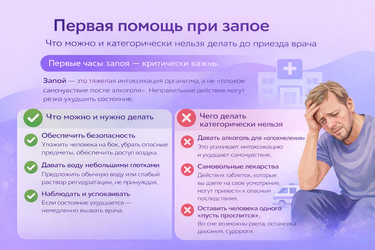 Четвертое - оставлять человека одного «пусть проспится». Во сне возможны остановка дыхания, аспирация рвотными массами, резкое падение давления. Контроль в первые часы критически важен.
