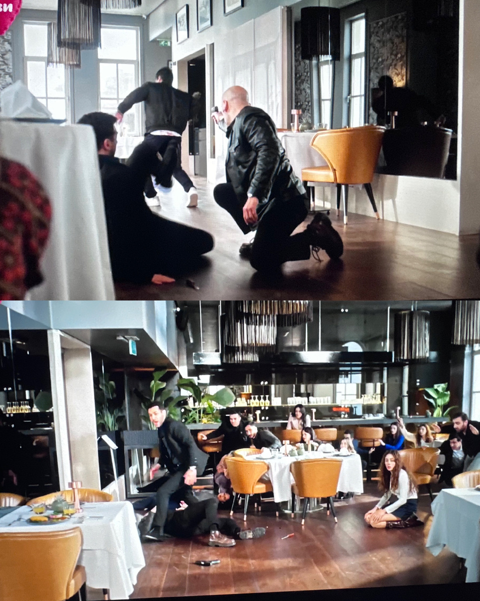В ресторане Серхат и преступник ведут борьбу, у каждого в руке оружие. В этот момент Аксель подрывается со своего места, и решает воспользоваться моментом, и покинуть зал.