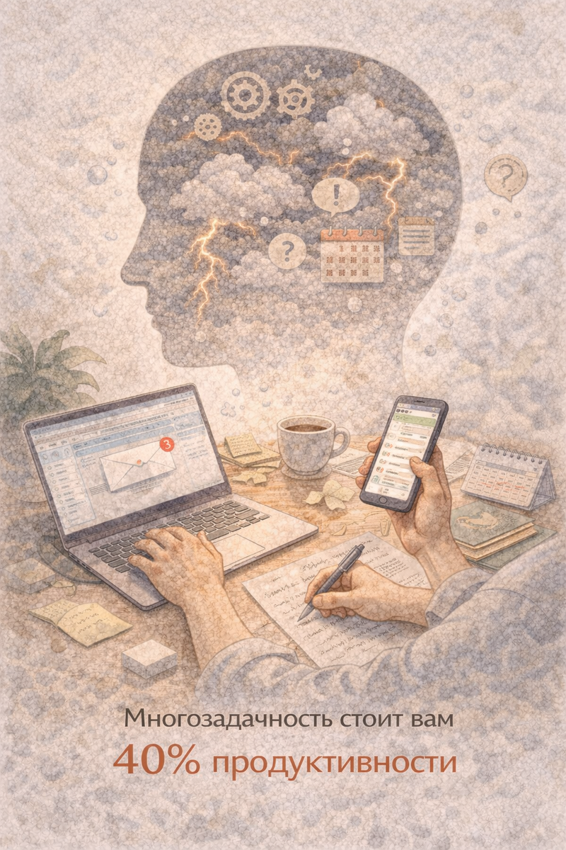 Что, если я скажу вам, что каждый такой эпизод «многозадачности» не просто утомляет, а буквально лишает вас 40% интеллектуальных ресурсов на последующие 20-30 минут? Что тот самый чат, на который вы отвлеклись «всего на минуту», украл у вашего основного проекта не 60 секунд, а полноценные полчаса качественного мышления?