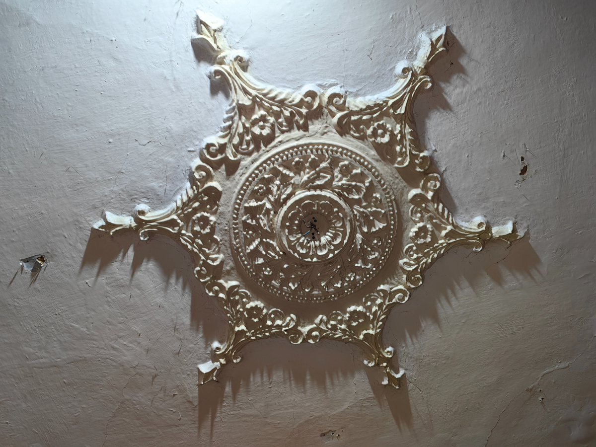 Работы было немного. Снят металлический профиль на потолке и можно рассмотреть получше старую розетку под люстру.