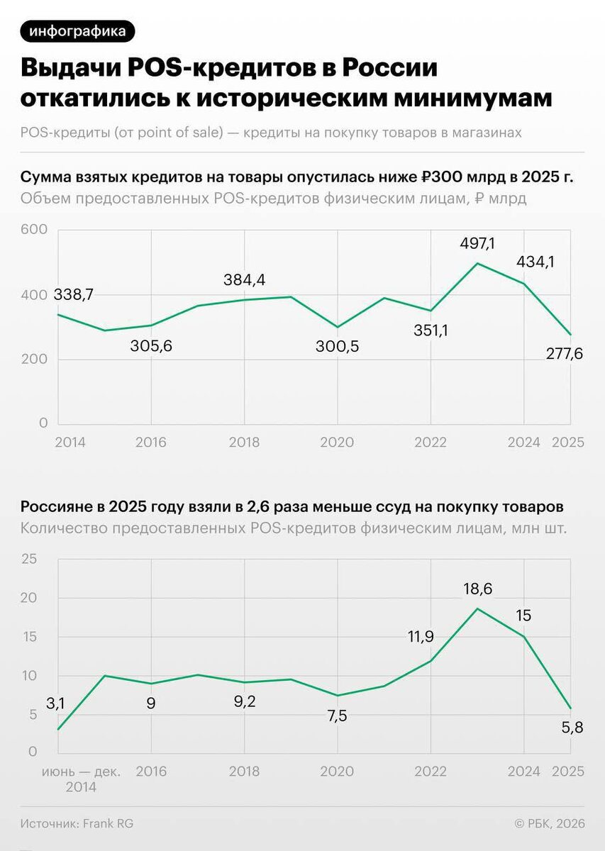 В прошлом году рынок POS-кредитов в России продемонстрировал худшие результаты за более чем 10 лет. Граждане оформили в банках 5,8 млн займов на покупки в магазинах на общую сумму 277,6 млрд рублей. Количество договоров сократилось в 2,6 раза, а объем кредитования — на 36,1% по сравнению с предыдущим годом. Эти показатели стали минимальными с 2014 года, когда начались наблюдения. Бизнес Финансович💰