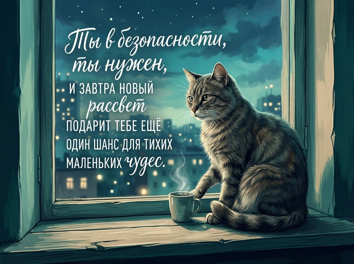 За окном тихо плывёт ночь, огни домов мерцают, как добрые звёзды, и каждый их огонёк шепчет: ты сделал сегодня достаточно, ты имеешь право на отдых и мягкую тишину. Позволь заботам дня раствориться, словно облакам в тёмно-синем небе. Дыши глубже, слушай, как мир замедляется, а вместе с ним успокаиваются и твои мысли. Пусть сон придёт к тебе, как мягкий плед — укроет, согреет и напомнит: ты в безопасности, ты нужен, и завтра новый рассвет подарит тебе ещё один шанс для тихих маленьких чудес.
