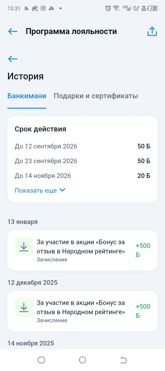 13 января повторно начислил 500 баллов за отзыв на банк, хотя за Совкомбанк я уже получила и больше никакие отзывы не писала. Проверяйте у себя.