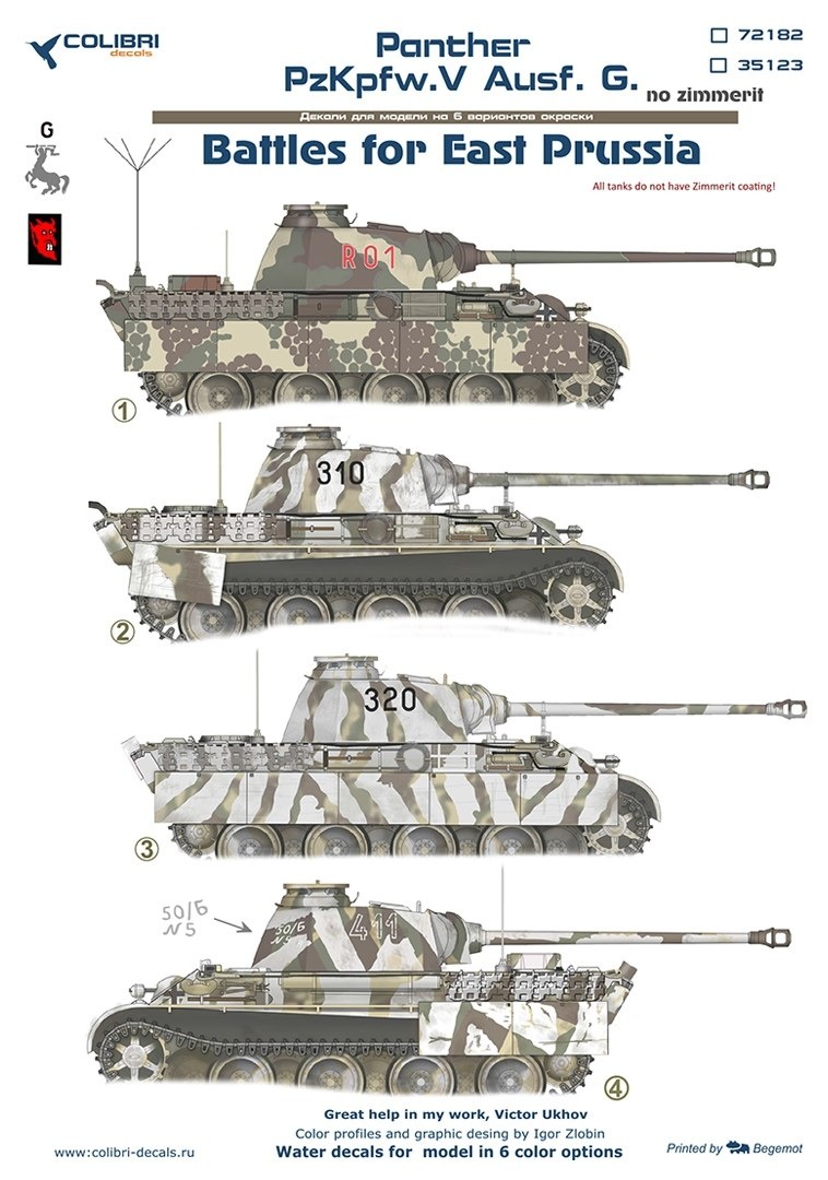 Новосибирская Colibri Decals выпустила декали для моделей безциммеритных "Пантер" производства зимы 1945 года в масштабах 1/72 (каталожный