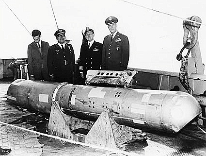 На фотографии — термоядерная бомба B28RI, поднятая с глубины 869 метров со дна Средиземного моря и размещеная на палубе спасательного корабля USS Petrel в ходе крупнейшей подводной операции по поиску утерянного ядерного оружия.