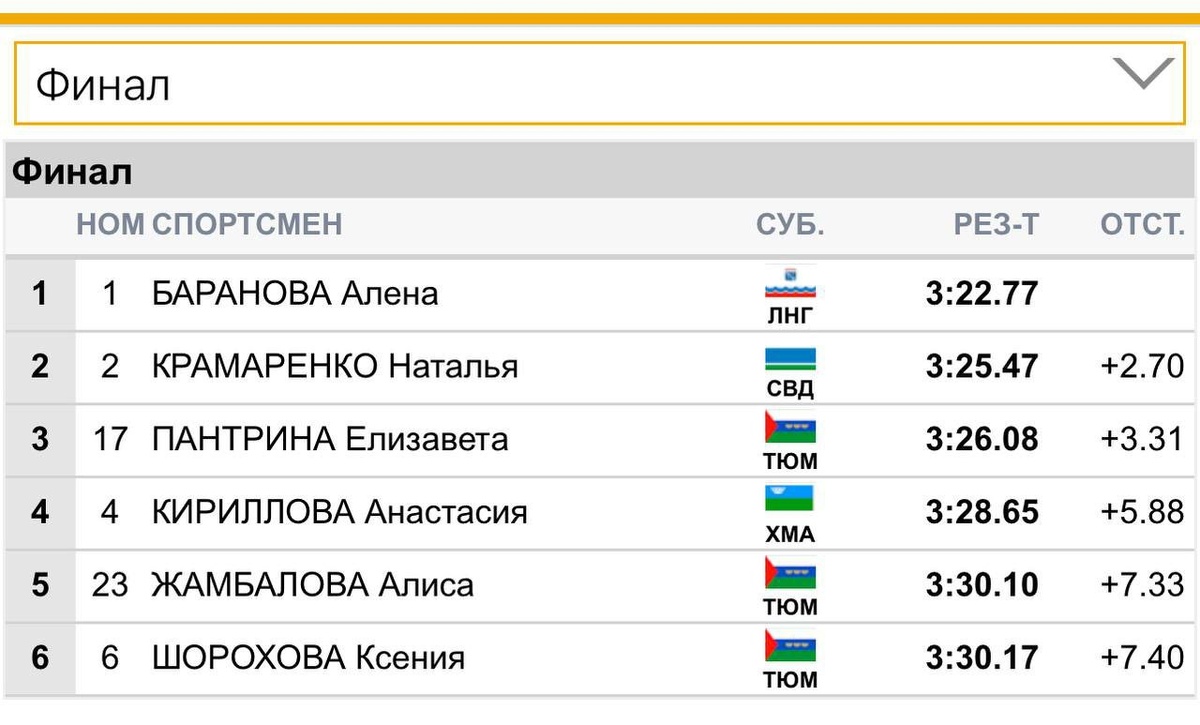 VI этап Казань Барышни Спринт классическим стилем. 1. Алена Баранова (Ленинградская область/Томская область) 2. Наталья Крамаренко (Свердловская область) 3. Елизавета Пантрина (Тюменская область) 4. Анастасия Кириллова (ХМАО-Югра) 5. Алиса Жамбалова (Тюменская область) 6. Ксения Шорохова (Тюменская область) Результаты: https://live.flgr-results.ru/9482