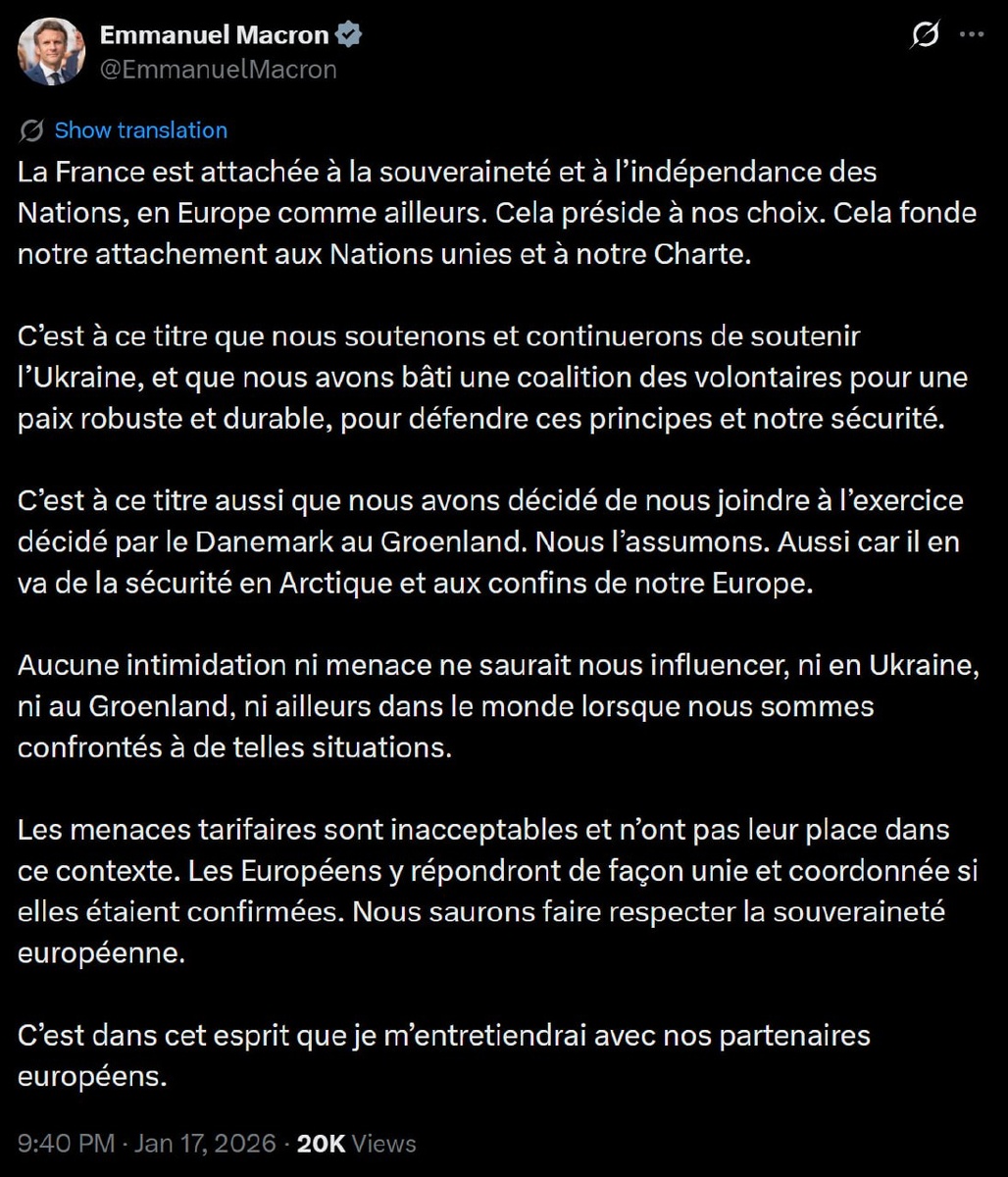 : Франция привержена суверенитету и независимости государств — в Европе и за её пределами. Это определяет наш выбор. Это лежит в основе нашей приверженности Организации Объединённых Наций и её Уставу. Именно поэтому мы поддерживаем и будем продолжать поддерживать Украину, и именно поэтому мы сформировали коалицию желающих ради прочного и долговечного мира — чтобы защищать эти принципы и нашу безопасность. И именно поэтому мы приняли решение присоединиться к учениям, инициированным Данией в Гренландии. Мы берём на себя эту ответственность. Также потому, что речь идёт о безопасности в Арктике и на дальних рубежах нашей Европы. Никакие запугивания и угрозы не смогут повлиять на нас — ни в Украине, ни в Гренландии, ни где-либо ещё в мире, когда мы сталкиваемся с подобными ситуациями. Тарифные угрозы неприемлемы и в данном контексте неуместны. Если они подтвердятся, европейцы ответят на них едино и скоординированно. Мы сумеем обеспечить соблюдение европейского суверенитета. Именно в эт