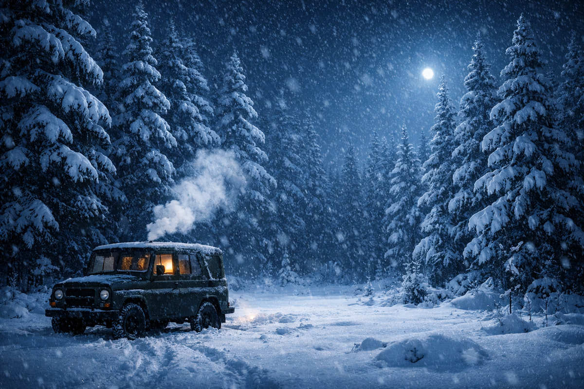 Глухая ночь падает на зимнюю тайгу, придавливая верхушки елей. В глуши, где до жилья может быть сотня километров снега, тишину нарушают два звука: урчание мотора и сухой треск остывающей стали. Нагретый за день борьбы с бездорожьем металл кузова сжимается на морозе в минус тридцать, словно жалуется на судьбу. Эта жалоба глухо отдается в ребрах, будто сама машина стонет вместе с людьми. Вокруг — тьма, и только тусклый свет приборов выхватывает лица четверых мужчин, на которых перемешались усталость, сосредоточенность и тихое упрямство, не позволяющее признать страх вслух.