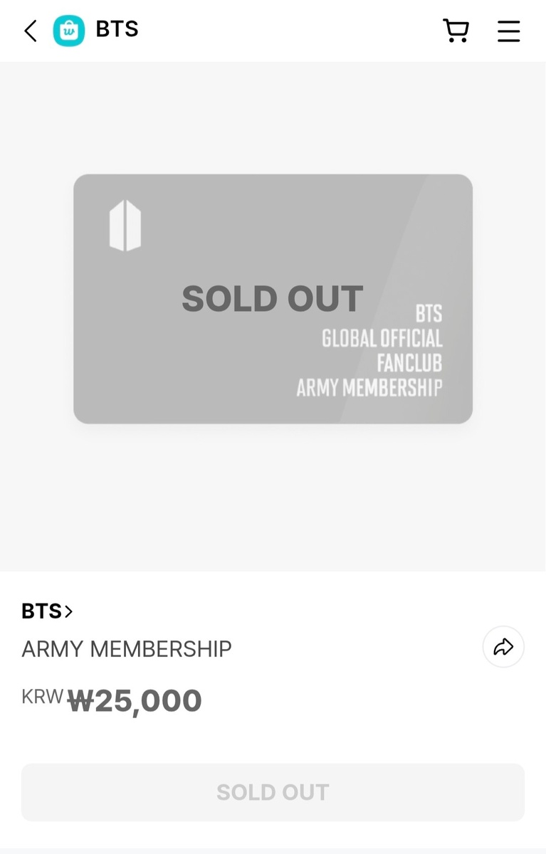 ✨ Global Membership ушёл в солдаут За последние несколько дней было оформлено настолько большое количество ARMY Membership (Global), что платформа Weverse приостановили распродажу мембершипов. По всей видимости, нагрузка на сервера оказалась критической. 🤭 Ожидаем возобновления возможности оформления. Как только появятся обновления — сообщим. #BTS #Weverse #Мяу @ibtsbomb