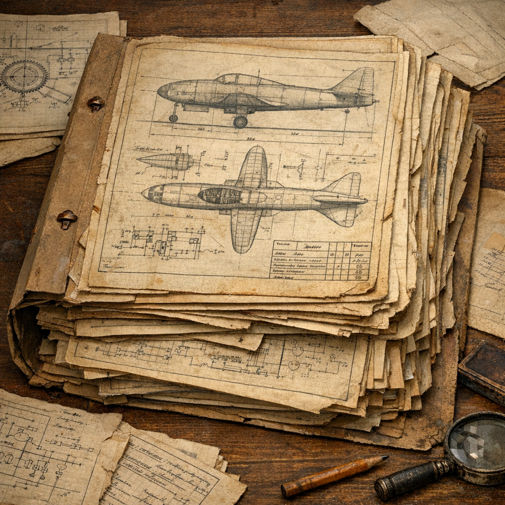 Пожелтевшие листы, чертежи, схемы.