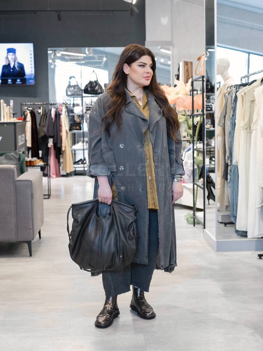 • Широкий крой в бедрах и мягкая линия складок — визуально стройнит и скрывает зоны, которые хочется смягчить.