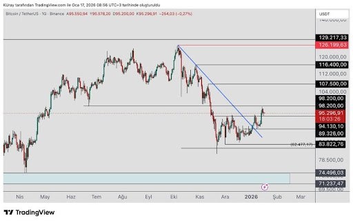 Биткойн удерживается выше ключевой поддержки на выходных, сохраняя в фокусе уровни $98,200 и $107,500. Участники рынка внимательно следят за тем, сможет ли восходящий тренд продолжиться или выходная ликвидность спровоцирует тестирование более низких уровней. Ближайшие сессии могут определить краткосрочную траекторию BTC. 📊 Ключевые моменты: - $94,630 является критически важным уровнем поддержки H4, удержание которого имеет решающее значение. - Прорыв выше $98,200 открывает путь к $107,500. Закрытие выше $107,500 может сигнализировать о продолжении бычьего тренда. - Потеря уровня $94,630 может привести к снижению до $83,822 – $82,477 и далее до $74,496 – $71,237. - Для быков: удержание текущих минимумов и прорыв выше $95,820 для открытия длинных позиций с целью $97,960.