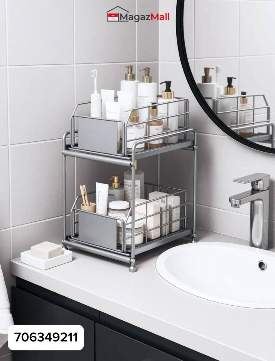 Двухъярусный выдвижной органайзер на металлическом каркасе — компактная «мини-станция» для хранения, которая собирает мелочи в аккуратные блоки. Он выглядит строго и опрятно, а это важно: в ванной и на кухне всегда много упаковок, флаконов и баночек, и именно они чаще всего создают визуальный шум.