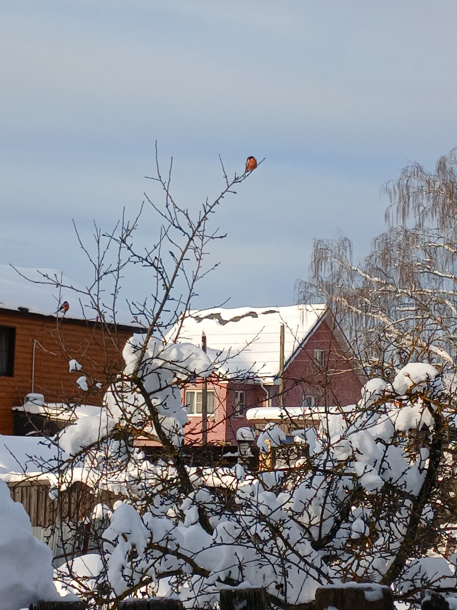 На участке, на старой яблоне, висит кормушка для птиц. Сегодня там кормились снегири ))