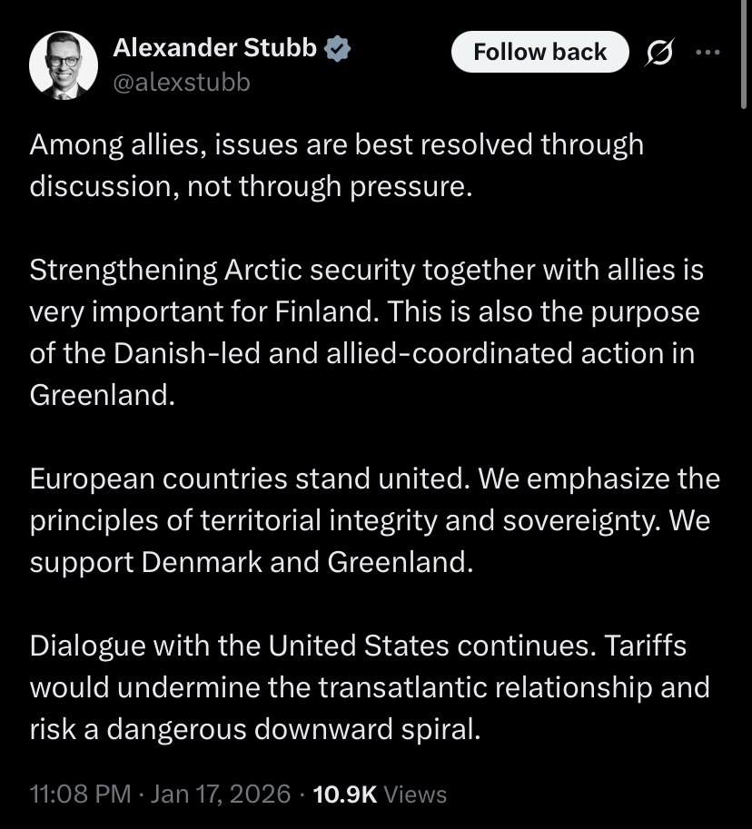 ‘DISCUSSION not pressure’ is needed to resolve US/Greenland crisis — Finland Prez Stubb
