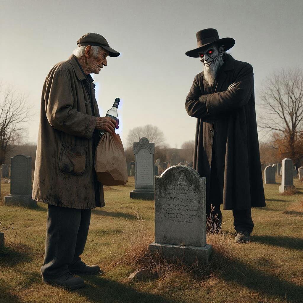 Как обычно, под покровом сгущающихся сумерек, Иван Егорович брёл вдоль могил, волоча за собой пакет с "угощениями" и мятую полуторалитровую бутылку из-под минералки, доверху наполненную "кладбищенскими кубками". В пакет он складывал подношения с могил, в бутылку сливал щедрые остатки алкогольных возлияний, перемешивая для получения элитной "Бычьей смерти". Изрядно "причастившись" к памяти предков, он, еле передвигая ноги, плелся вдоль забора, мечтая лишь об одном: добраться до сторожки и упасть замертво. Но в этот роковой вечер, словно из-под земли, перед ним возник сам чёрт! Самый настоящий, рогатый и копытный, лукавый искуситель. Чёрт молча взирал на Ивана Егоровича, и во взгляде его смешались жалость, ненависть и… презрение. Столь мощный эмоциональный коктейль оказался непосильной ношей для старого и дряхлого сердца сторожа. Чёрт ничего не говорил, хотя обычно во всех сказаниях должен, но тут иной случай. Иван Егорович рухнул, как подкошенный, и, падая, машинально вцепился руками в волосатые ноги черта, вырвав из них клочья чёрной, как смоль, шерсти. Чёрт издал такой душераздирающий вопль, что вороны, облюбовавшие кладбищенские деревья, в панике взмыли в небо. Ну, право слово, депиляция без предварительной подготовки – это жестоко! Чёрт, разумеется, тут же испарился, а Иван Егорович отправился прямиком в рай (или куда там отправляются сторожа кладбищ?). Так и похоронили его, с клочьями чертовой шерсти, крепко зажатыми в руках. Разогнуть окоченевшие пальцы так и не смогли. Теперь на кладбище новый смотритель – Пётр Алексеевич. Будем надеяться, что ему повезёт больше, и чёрт его не напугает.