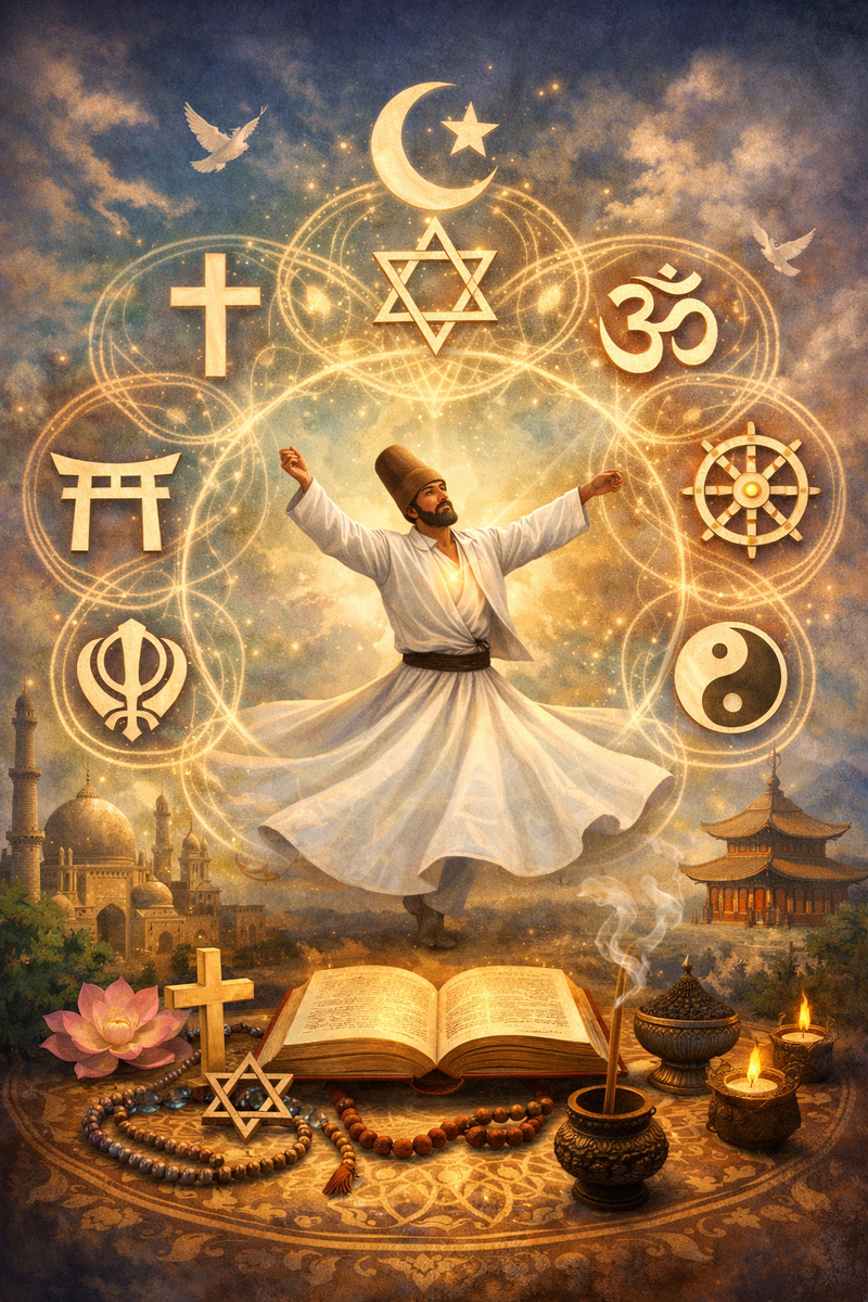 Такой подход делает суфизм особенно открытым к диалогу с другими духовными традициями. В центре внимания оказывается не конфессиональная принадлежность, а универсальные ценности: любовь, милосердие, смирение, истина и единство бытия. Эти идеи находят отклик в христианской мистике, иудейской каббале, буддийской практике осознанности и индуистской философии адвайты.