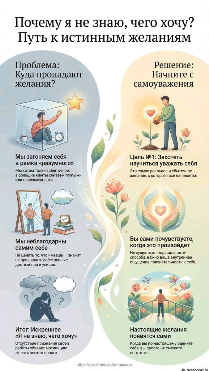 А что потом? Тишина. В прошлый раз мы говорили, как ставить дерзкие и вдохновляющие цели. Но возникает вопрос: а откуда брать смелость их хотеть? Часто после честного вопроса «Чего я хочу?» в голове повисает пустота. Или приходят только «разумные», маленькие желания. Знакомо? Проблема не в лени или недостатке фантазии. Всё глубже. 🧠 Ловушка «разумных желаний» Мы с детства учимся хотеть только то,что можно потрогать и легко достичь. Большие, светлые, но пугающие мечты мы отбрасываем как «глупости» или «несбыточное». И в итоге заглушаем сам голос своих истинных желаний. 💔 Корень проблемы — неблагодарность к себе Главный тормоз— мы обесцениваем собственный путь. Не ценим то, что уже преодолели, сделали, пережили. А кому хочется хотеть нового, если прошлые победы не считаются победой? Ваше подсознание — как талантливый сотрудник. Оно не будет «работать» и генерировать новые желания, если его не ценят и не благодарят за прошлые достижения. 🎯 Решение: начать с самоуважения Первая и