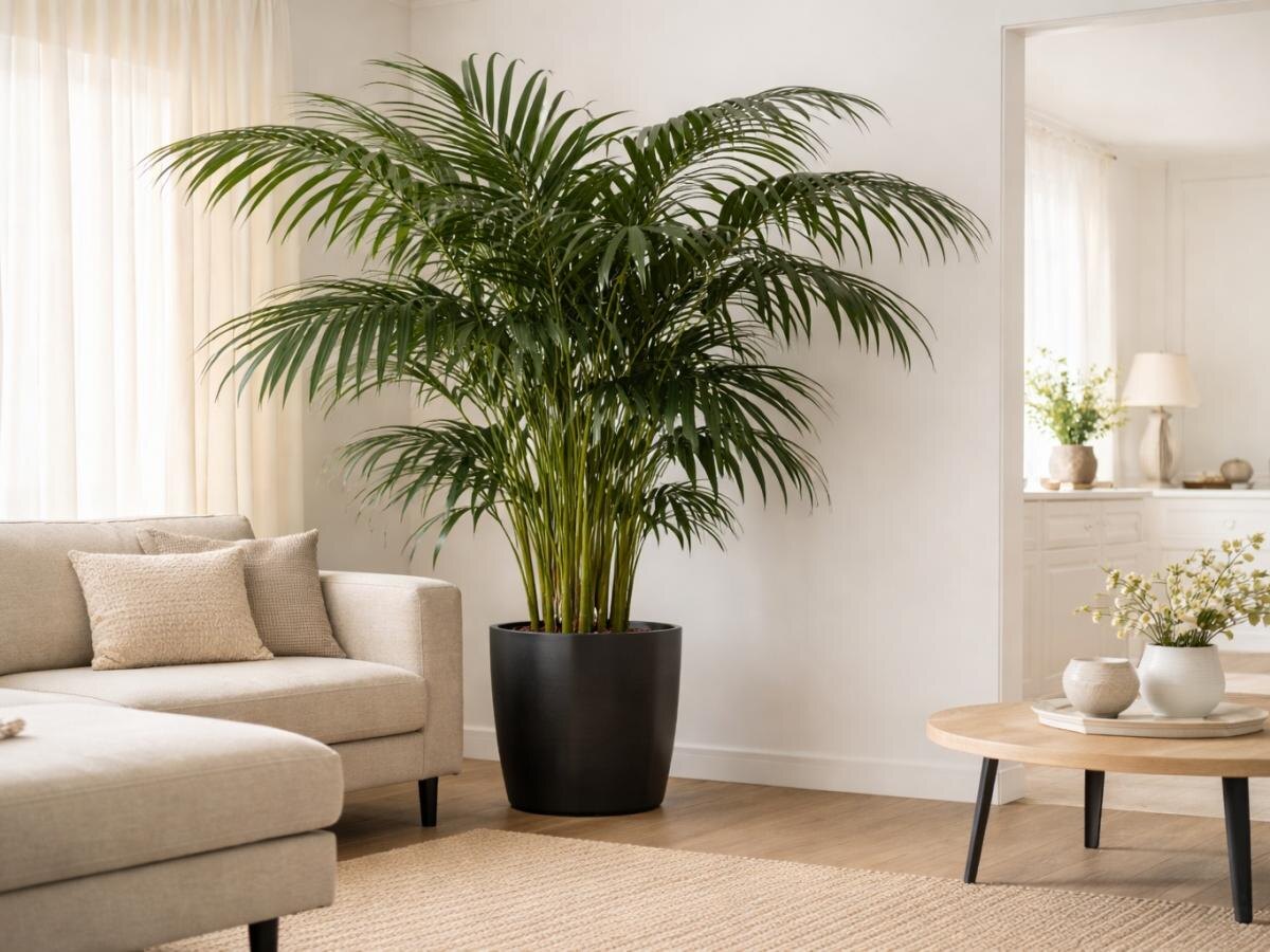 Комнатные пальмы давно вышли за рамки экзотики и стали полноценной частью современных интерьеров. Они визуально вытягивают пространство вверх, добавляют ощущение воздуха и делают комнату более собранной. При этом большинство видов растут медленно и не требуют сложного ухода, что особенно ценно в условиях городской квартиры. Главное достоинство пальм — их вертикальный характер роста. В отличие от раскидистых растений, они занимают минимум места у основания и стремятся вверх, заполняя пустоты под потолком. За счет этого даже небольшая комната начинает казаться выше и просторнее. Еще одно важное преимущество — предсказуемость. Домашние пальмы прибавляют в среднем 10-15 сантиметров в год. Это позволяет заранее понимать, как растение будет выглядеть через несколько лет, и избавляет от частых пересадок или необходимости постоянно корректировать интерьер. Среди комнатных пальм есть универсальные фавориты, которые подходят большинству квартир. Ховея Форстера ценится за выносливость и благородн