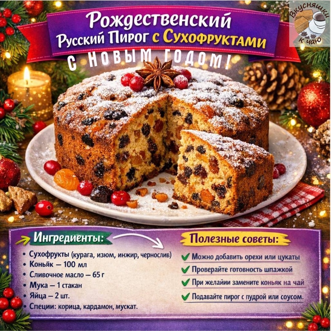 ! ✨ Мечтаете о тёплой, душистой и невероятно вкусной выпечке к праздникам? Наш русский рождественский пирог — это именно то, что нужно! 💎 Всё гениальное — просто: ▪️ Сухофрукты, томлённые в коньячном сиропе. ▪️ Нежное, тающее во рту тесто. ▪️ Аромат, от которого слюнки текут. Идеальный проект для уютного вечера! Готовится легко, съедается мгновенно, а воспоминания оставляет на года. 🍂☕️ ➡️ Полный рецепт с лайфхаками ! #рождество #зимниедесерты #пирог #сухофрукты #уютнаякухня #вкусдома #рецепт