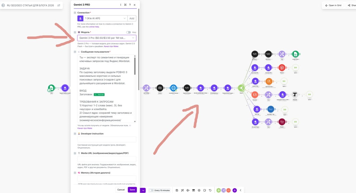 КАКИЕ ПЛЮСЫ : — Автоматизация полностью оплачивается с одного места и есть возможность оплачивать рублями обычной картой — Мне больше понравилось как пишет Gemini 3pro чем GPT 5.2 — Выходит гораздо дешевле чем в ГПТ и чем с офф АПИ Gemini — Есть возможность даже транскрибировать аудио и видео, передавай просто ссылку в поле медиа items В модуль добавил ещё модельки Gemini 3 Flash ($0.15/$0.90 per 1M) — быстрый + 1M контекст gemini-2.5-pro gemini-2.5-flash , они дешевле и очень хорошо справиться с чатами, ботами, и там где не особо думать надо Блюпринт доступен на канале обучения и в папке ❤️ Обучение по Make.com, нейросетям и Вайб-кодингу 🔛 Папка с blueprint и модулями для make #Make #AI #Gemini #Автоматизация #контентзавод