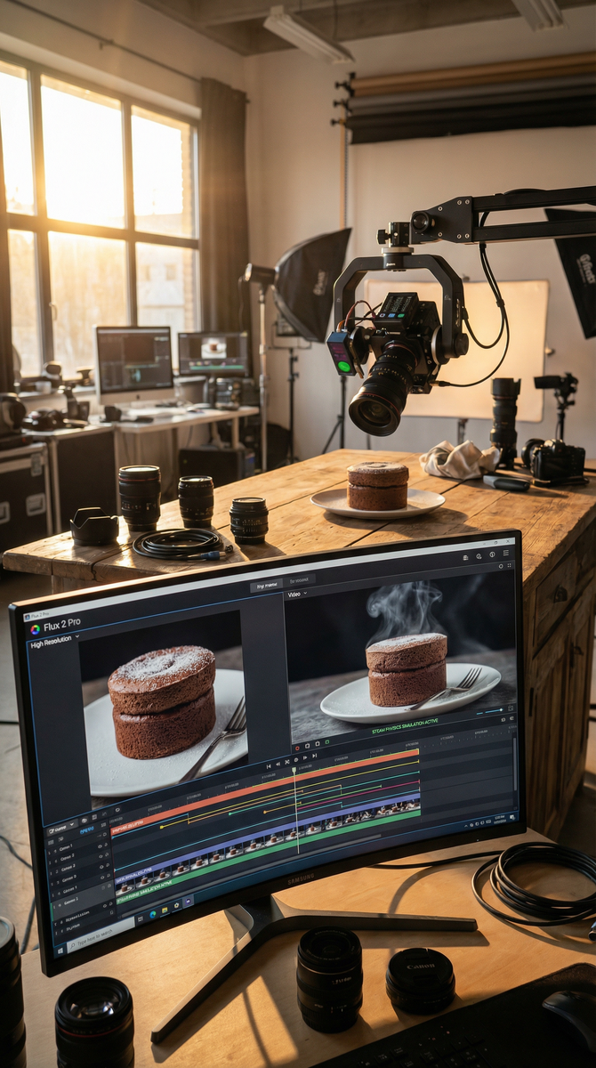 Представьте: вы создали идеальное фото блюда в Flux 2, но в Instagram Reels и TikTok нужны видео. Раньше пришлось бы нанимать оператора или осваивать монтаж. Сегодня Flux 2 генерирует не просто фото, а полноценные видео-сцены с движением камеры, паром от блюд и динамическим освещением. За 5 минут вы получите контент, за который подписчики примут вас за профессионального видеографа. Большинство авторов тратят часы на конвертацию статичных изображений в видео: добавляют панорамирование в CapCut, вручную расставляют ключевые кадры, ищут музыку. Результат всё равно выглядит искусственно. Flux 2 решает эту проблему встроенным motion engine, который понимает не только визуал, но и кинематографические законы движения. Ключевая особенность: Flux 2 генерирует не последовательность кадров, а полноценную сцену с физикой движения камеры и объектов. Базовый промт (новичок): professional chocolate souffle, steam rising, warm lighting Продвинутый промт для видео (профи): Cinematic 4K shot of chocol