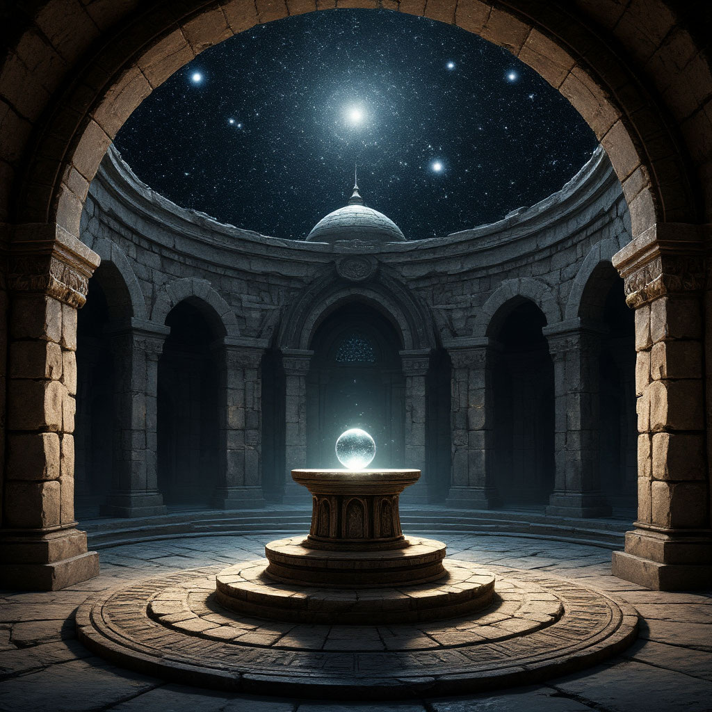 То, что ищет путник в пещерах под Иремом: камеру семи сфер. Как только путник приблизится к тому месту, он увидит, что не так то и просто будет пройти туда. Он увидит разверзшуюся бездну перед собой, уходящую в глубины вниз, и парящий островок, откуда исходит свет. Добраться до него придется по кружащимся вокруг него маленьким островкам. Только они воссоздадут путь к центру. И как