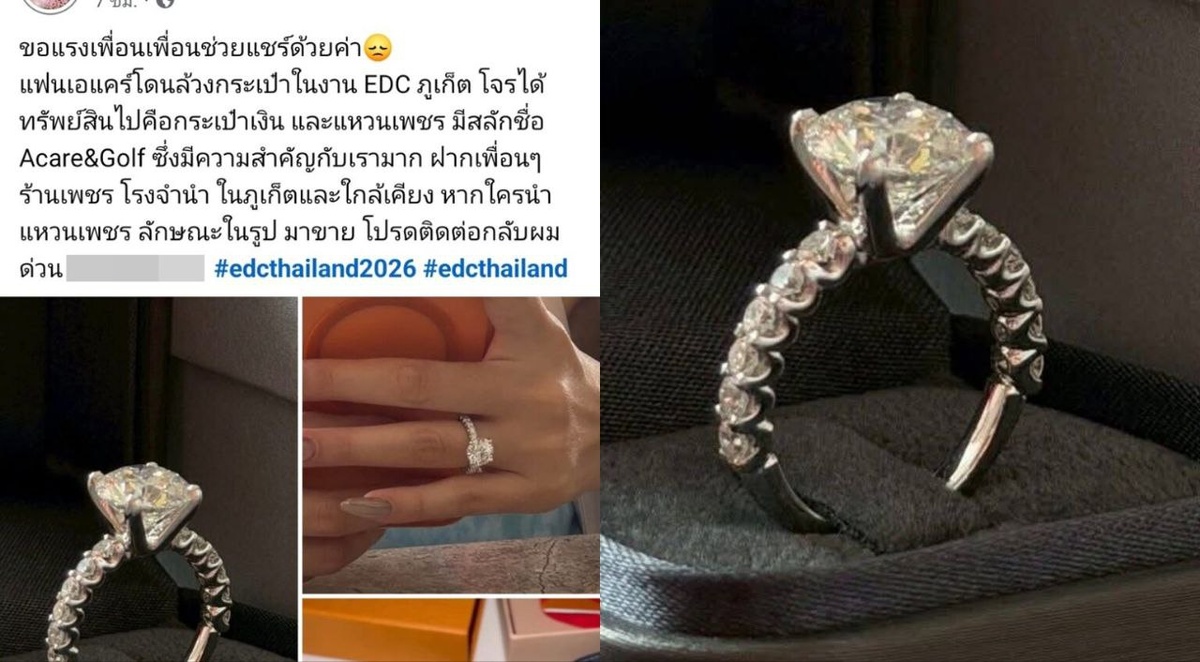 Вчера вечером на фестивале EDC Thailand 2026 в Пхукете произошёл инцидент, который разрушил тщательно спланированное романтическое событие. Пара из Чиангмая — молодой человек по имени Golf и его девушка Acare — прилетела на фестиваль специально, чтобы посетить специальную зону для предложений руки и сердца. Golf привёз с собой бриллиантовое кольцо с гравировкой «Acare & Golf». Около 21:00, стоя в толпе, мужчина заметил подозрительные уведомления от банка. При проверке обнаружилось, что с его кредитной карты списано около 300 000 бат. Деньги списали на дропа с картой арабских эмират. В сумке на груди зияла открытая молния: пропал кошелёк Louis Vuitton, в котором лежали кольцо, документы обоих, водительские права, наличные и несколько банковских карт. Предложение так и не состоялось. Пара обратилась в полицейский участок Cherng Talay. Полиция сообщила, что подобные случаи раскрыть крайне сложно, если только вор не попытается сбыть кольцо в ювелирном магазине или ломбарде. Acare опуб