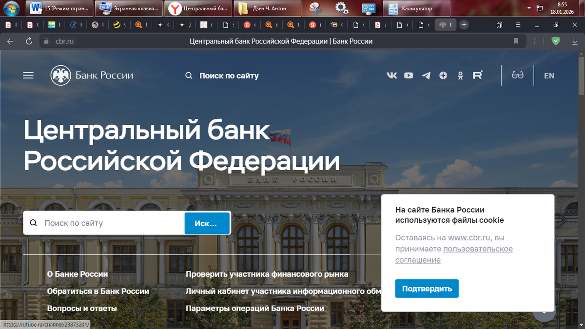 Получаю доступ на земле через World Wide Web (Всемирная Компьютерная Сеть) в информационно-телекоммуникационную сеть Internet («Интернет») и через соответствующую поисковую систему (браузер) на страницу сайта URL - адрес: https://cbr.ru/ Центральный Банк Российской Федерации | Банка России. Фотографию от 18.01.2026 г. сайта прилагаю следующую. Есть Федеральный закон "Об информации, информационных технологиях и о защите информации" от 27.07.2006 N 149-ФЗ. В силу названного ФЗ ст. 2. в настоящем Федеральном законе используются следующие основные понятия: 17) владелец сайта в сети "Интернет" - лицо, самостоятельно и по своему усмотрению определяющее порядок использования сайта в сети "Интернет", в том числе порядок размещения информации на таком сайте. Таким образом, возникает вопрос, как перепроверить, кто или что является владельцем сайта банка? Допустим CBR это аббревиатура, но от каких слов? Приложение: 18 день месяца Января 2026 г. Чел. Антон М.К.