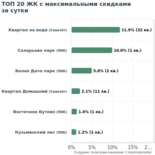 🟩 Честные скидки: 6 ЖК (48 кв.) 🟧 Маркетинг скидки: 1 ЖК (7 кв.) 💎 МАКСИМАЛЬНАЯ ЭКОНОМИЯ 🏆 Самолёт • Квартал на воде ├🔻2.2M → 18.6M • 1-к 45м² ├🔻2.2M → 23.0M • 2-к 59м² └🔻1.3M → 32.6M • 3-к 93м² 🥈 ПИК • Саларьево парк └🔻1.7M → 17.5M • 2-к 50м² 🥉 Самолёт • Квартал Домашний ├🔻592к → 32.5M • 3-к 84м² ├🔻508к → 28.2M • 3-к 75м² └🔻506к → 28.1M • 3-к 75м² 4️⃣ ПИК • Белая Дача парк └🔻452к → 9.0M • 1-к 35м²❗️ 5️⃣ ПИК • Кузьминский лес └🔻214к → 17.2M • 2-к 49м² 🔑 САМЫЕ ДОСТУПНЫЕ 🏆 ПИК • Белая Дача парк ├🔻452к → 9.0M • 1-к 35м²❗️ └🔻156к → 11.1M • 1-к 39м²❗️ 🥈 ПИК • Восточное Бутово └🔻141к → 10.1M • 2-к 51м² 🥉 Самолёт • Квартал на воде ├🔻638к → 16.0M • 1-к 40м² ├🔻516к → 16.0M • 1-к 40м² └🔻653к → 16.3M • 1-к 40м² 4️⃣ Самолёт • Квартал Домашний ├🔻357к → 17.0M • 1-к 38м² ├🔻315к → 17.0M • 1-к 38м² └🔻318к → 17.1M • 1-к 38м² ❗️— лоту меньше месяца 👇 Полная статистика: 📲 В Telegram | 🌐 На MskMeter.ru