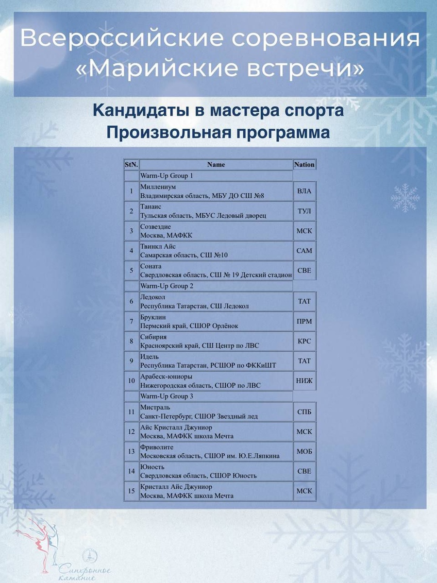 » 18 января 2026 года Кандидаты в мастера спорта Произвольная программа 14:15 Результаты короткой программы Онлайн-табло соревнований Онлайн-трансляция соревнований #ффккр #синхронноекатание #вс_марийские_встречи II этап Кубка России 18 января 2026 года Мастера спорта Произвольная программа 17:15 Результаты короткой программы Онлайн-табло соревнований Онлайн-трансляция соревнований #ффккр #синхронноекатание #2_ЭКР