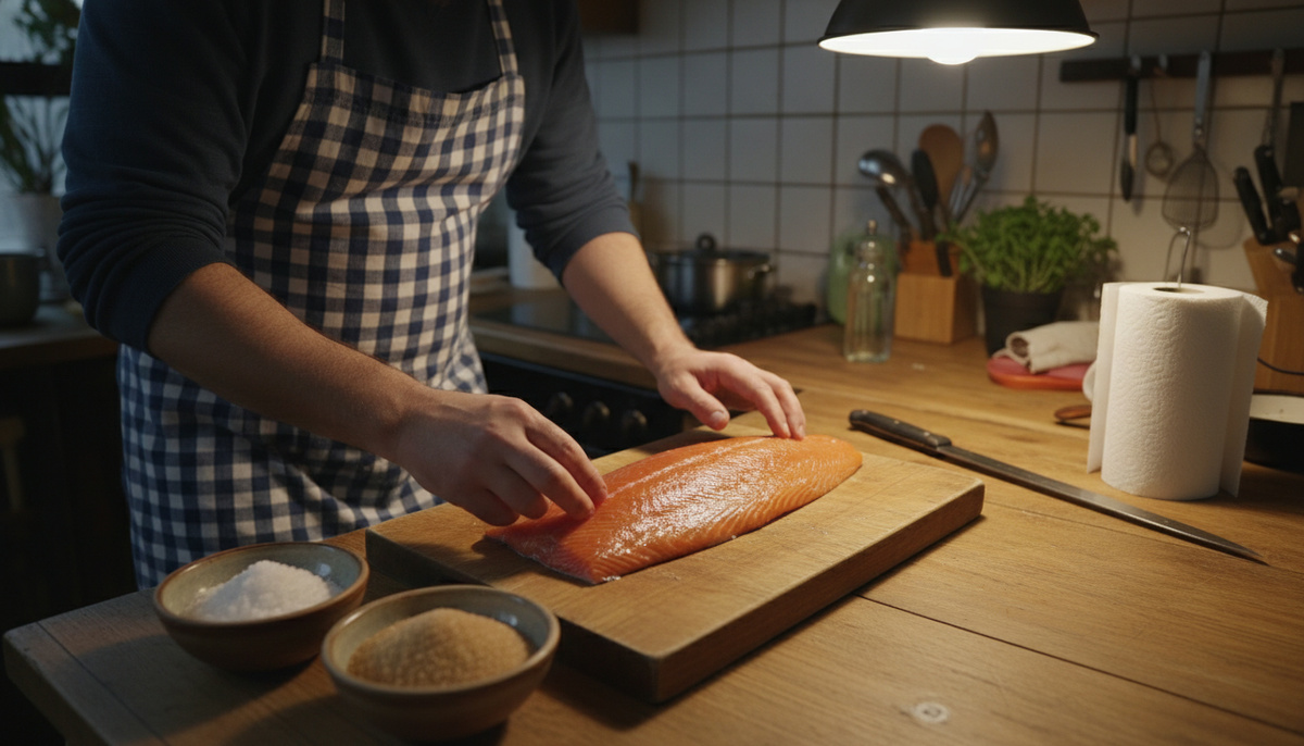 - Вариант Б — мягкий экспресс («прямо сейчас»): соль 2 ст. л. + коричневый сахар 2 ст. л. + минимум воды (только чтобы растворить). Обмазать/залить раствором и убрать в холод: от 30 минут для филе (дольше — по возможности).