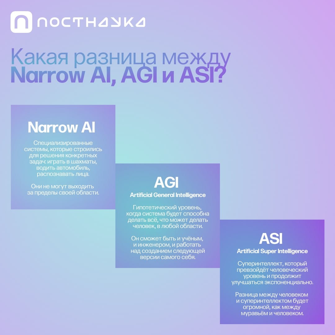 На данный момент термины AGI и ASI условны, но они помогают разобраться в разных этапах развития ИИ.