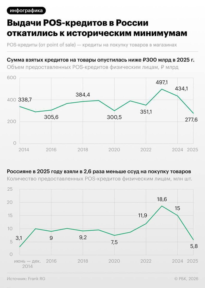 По данным Frank RG, физлица оформили лишь 5,8 млн кредитов на покупки в магазинах на общую сумму 277,6 млрд рублей. Число договоров сократилось в 2,6 раза, а их объём — на 36,1% по сравнению с предыдущим годом. Оба показателя стали минимальными за весь период наблюдений с 2014 года. #кредиты #экономика