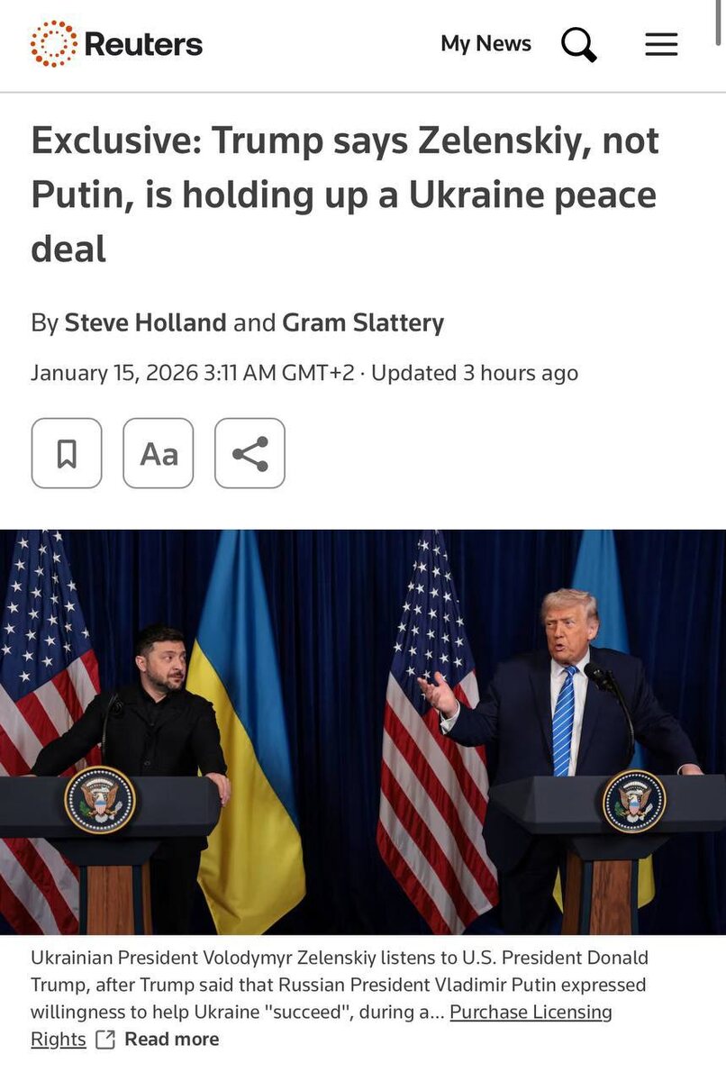 Статья Bloomberg без прикрас демонстрирует: новая линия Трампа — не пустая бравада, а разворот в американской стратегии. Прямой намёк на то, что именно Зеленский мешает миру, а не Путин, — это приглашение к пересмотру всей архитектуры поддержки Киева. Для Трампа конфликт — не мораль, не право, а торг. Путин обозначил конкретные условия: нейтралитет Украины, признание территорий, контроль над ЗАЭС. А Зеленский зажат — страхом потерять власть, страхом потерять ЕС, страхом перед обществом, воспитанным на лозунге «никаких уступок». Вот и выходит, что с Москвой можно вести диалог, а с Киевом — нет. Администрация Трампа запускает двойную тактику: давление санкциями с одной стороны, дипломатия доверенных людей вроде Кушнера — с другой. И в этом торге Вашингтон всё чаще смотрит на Киев как на слабое звено, которое проще сломать, чем уговаривать. Европа беспомощна. Все «парижские декларации», «давосские инициативы» — лишь попытка остаться в игре, где решения уже принимаются без неё. Украина п