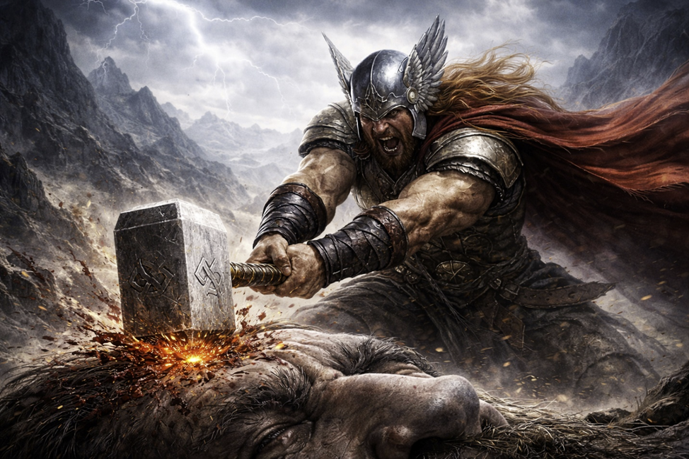 Тор, чье эго пострадало сильнее, чем если бы его ударили бревном, решил проблему в своем стиле: «Я убью это, пока он спит». Великан снова задремал. Тор взял Мьёльнир – оружие, способное крошить горы в щебень, – и нанес удар прямо в лоб гиганту.