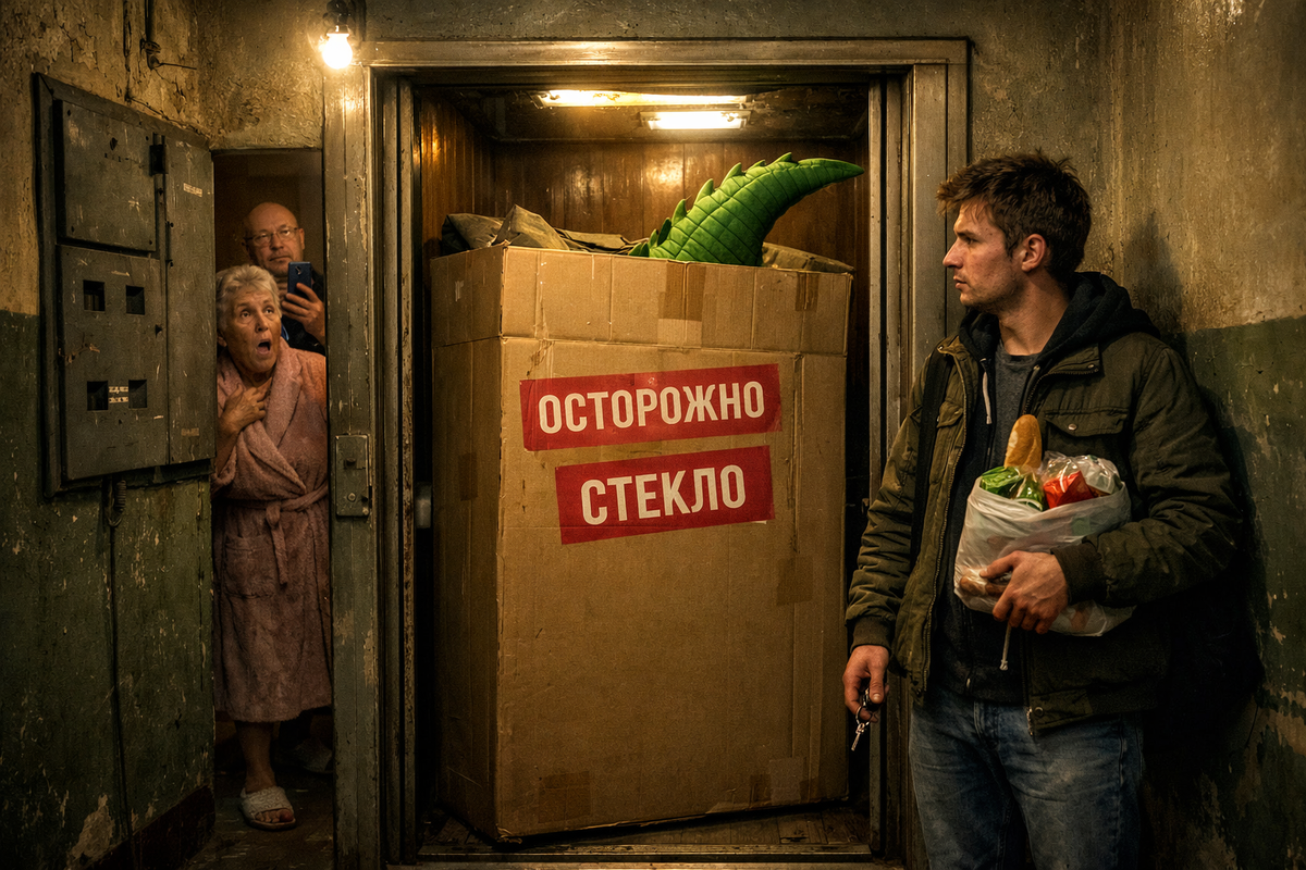В кабине лифта, заняв почти всё пространство, стоит огромная коробка. Высотой мне до пояса и такая широкая, что протиснуться рядом нереально. На боках чёрным маркером крупно написано: «ОСТОРОЖНО», «СТЕКЛО», «АККУРАТНО». Я даже присвистнул – не каждый день увидишь такое сооружение у себя дома. Коробка явно мешает: ни зайти, ни выйти нормально. Наверное, курьер оставил, а забрать не успели.
