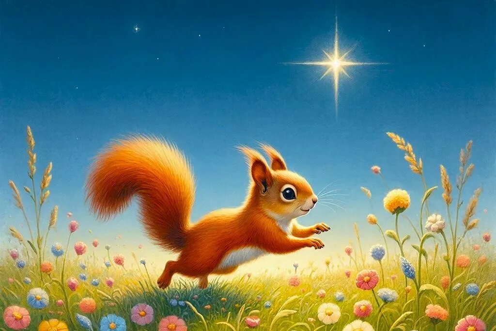 Как Бельчонок нашёл Звезду Сказка для детей В тихом лесу, где вековые сосны шептали сказки ветру, жил маленький Бельчонок по имени Хвостик. Он был любопытный и непоседливый, любил прыгать по веткам и собирать орехи. Но больше всего на свете Хвостик любил смотреть на звезды. Однажды ночью, когда луна играла в прятки за облаками, Хвостик увидел падающую звезду. Она прочертила огненную полосу в небе и, казалось, упала где-то совсем рядом. Забыв про сон, Бельчонок решил во что бы то ни стало найти ее. Утром, как только первые лучи солнца коснулись верхушек деревьев, Хвостик отправился в путь. Он бежал через поляны, перепрыгивал ручьи и лазил по скалам. На пути ему встречались разные лесные жители: мудрая Сова, ворчливый Барсук и веселая Лягушка. Каждый из них давал Хвостику совет, но никто не знал, где упала звезда. Уже почти отчаявшись, Бельчонок вдруг увидел странное мерцание вдали. Подбежав ближе, он обнаружил маленькую звездочку, зацепившуюся за ветку старого дуба. Звезда была совсем м