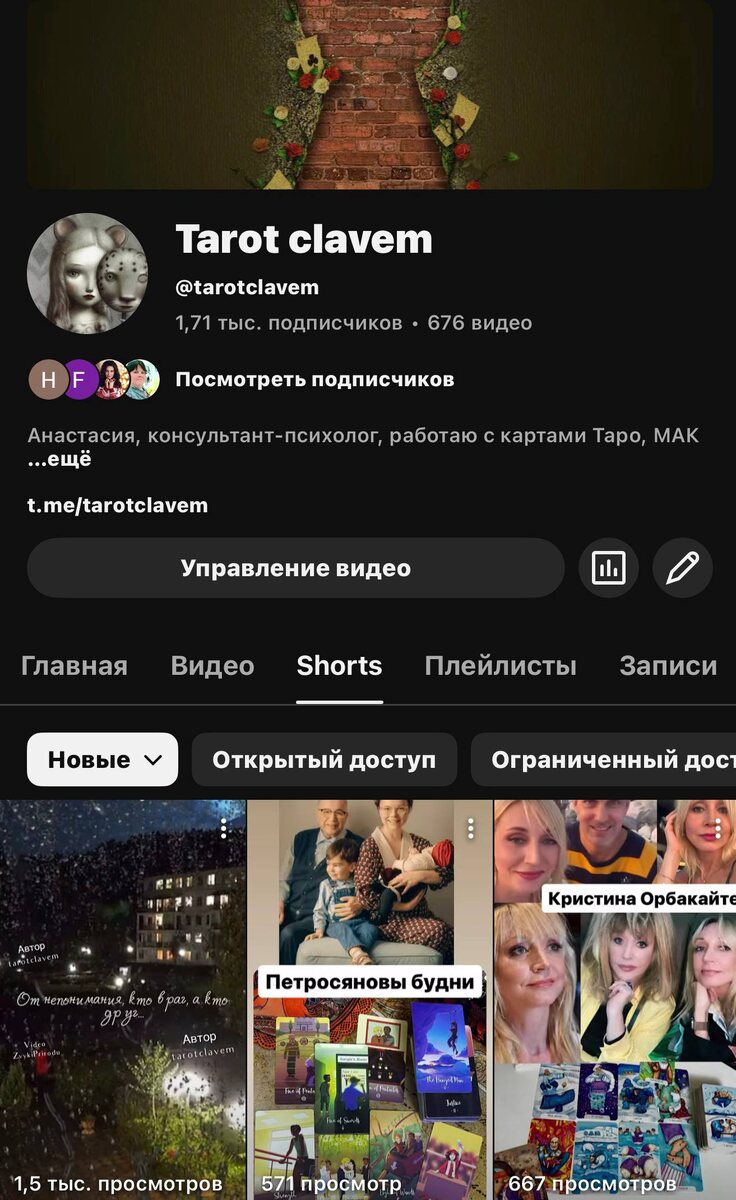 , что хочу сделать в 🤩🤩🤩🤩 И пришла к тому, что это ✏️задачи: ⚙️возродить 📱 https://youtube.com/@tarotclavem?si=Wp8EVnTCFbzeGro- Там я публиковала прогнозы на месяц по знакам зодиака, иногда снимала благотворительные расклады, в планах было делать «живые»-видео разборы на интересные вам темы. Контент планирую дублировать на ДЗЕН. ⚙️открыть канал в тг с обучением, это будет подписка с видео-обучением и чатом по вопросам работы с картами, а также возможностью обмениваться опытом друг с другом, выбором колод и практическими знаниями. Я прошу вас поддержать канал ютуб подпиской и реакцией ♥️ А те, кому интересного обучение у меня, написать в чат и поставить реакцию 🔥 Спасибо за обратную связь🫶🏻