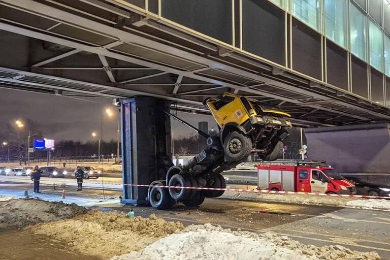 Самосвал на базе МАЗ 6x4 врезался в пролет перехода у станции метро "Технопарк" в Москве днем 17 января