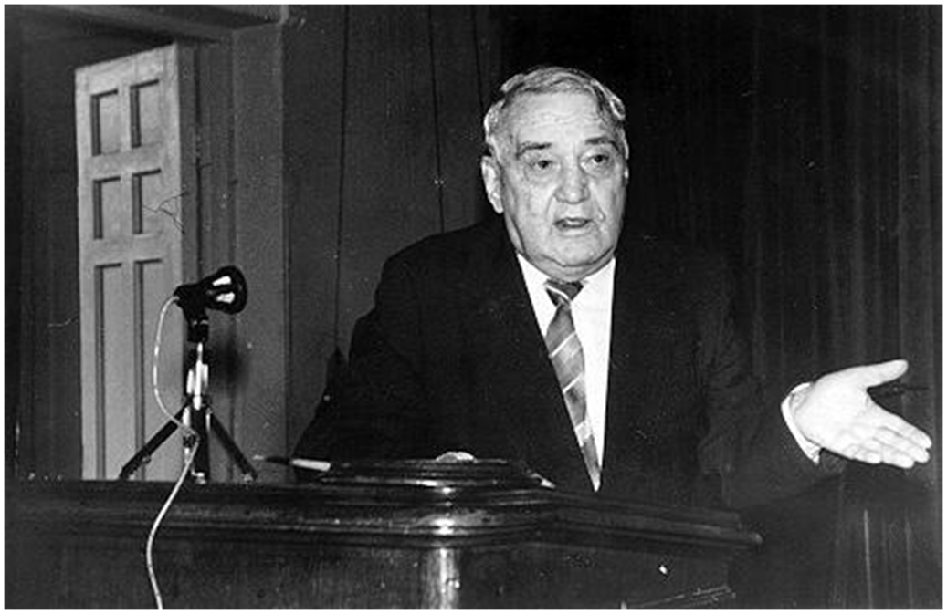Л.Н. Гумилёв выступает в актовом зале Русского Географического общества, Ленинград, 80-е годы. Источник: Фотографии Л.Н. Гумилёва и его семьи. http://www.kulichki.com/~gumilev/fund/fund13.htm