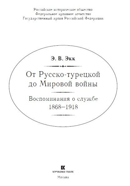Экк Э. В. От Русско-турецкой до Мировой войны: Воспоминания о службе. 1868–1918 / Вступ. ст. Н. П. Грюнберга, коммент. А. И.Дерябина. М.: «Кучково поле»; «Аудит недропользования и консалтинг», 2014. 576 с. (Серия «Живая история»)