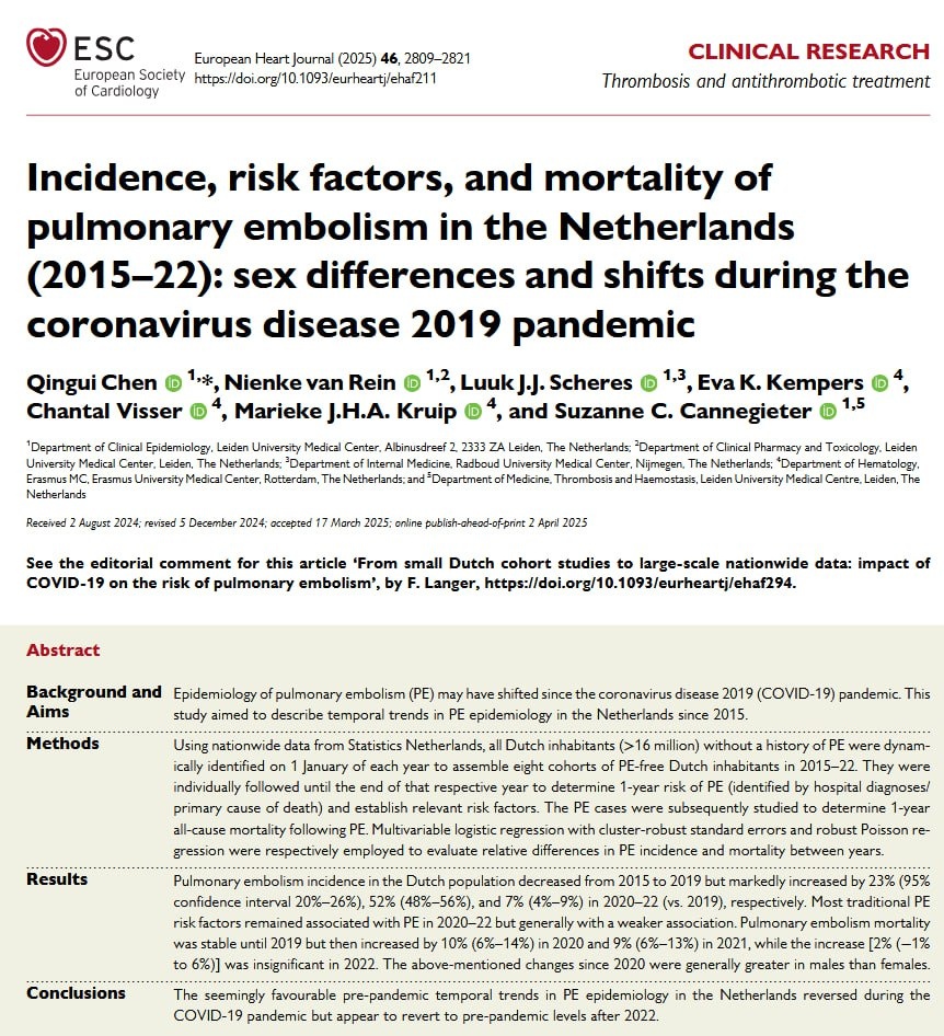 🫁 ТЭЛА после коронавирусной инфекции: эпидемиология, которая внезапно «сломалась» — и почти вернулась назад Мы привыкли думать, что тромбоэмболия лёгочной артерии (ТЭЛА) — это «стабильная» проблема с более-менее понятными факторами риска и прогнозом. Но данные по всей популяции Нидерландов за 2015–2022 годы показывают: пандемия COVID-19 буквально переписала правила, пусть и не навсегда. 📉 До 2019 года всё выглядело обнадёживающе: частота ТЭЛА медленно снижалась, а смертность оставалась стабильной — на фоне лучшей диагностики, более раннего лечения и активного амбулаторного ведения. 📈 А потом пришёл COVID. Уже в 2020 году частота ТЭЛА выросла примерно на 23%, в 2021 — на 52% (!) по сравнению с 2019 годом. В 2022 рост был куда скромнее — около 7%, что выглядит как постепенный возврат к «допандемической норме». 💀 Смертность тоже подросла. Если до пандемии 1-летняя смертность после ТЭЛА держалась на одном уровне, то в 2020–2021 годах она увеличилась примерно на 9–10%. И снова — в 2022