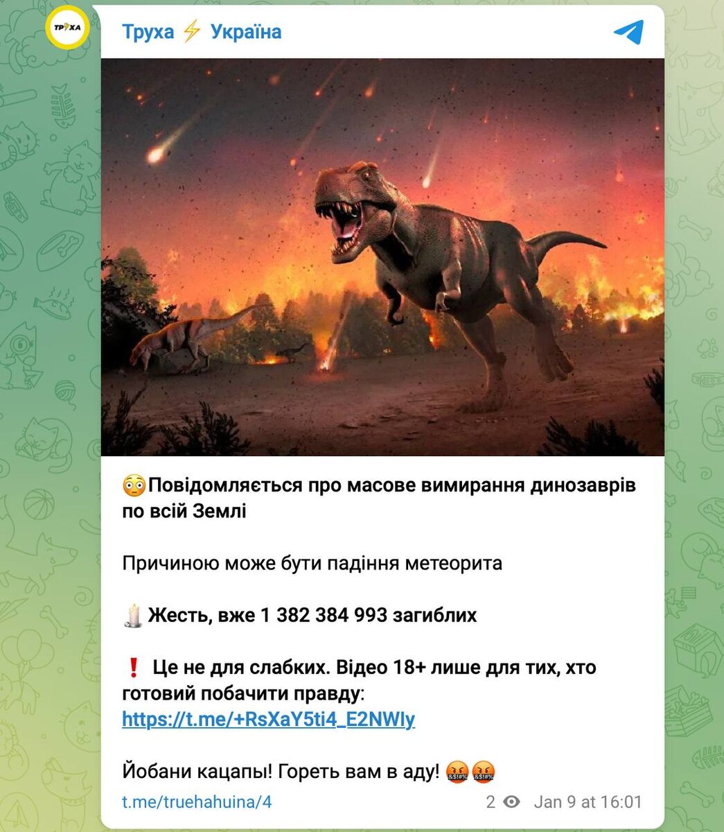 «Кацапы уничтожили всех динозавров, когда-либо обитавших на Земле», — утверждают украинские источники, близкие к мезозою.))🤣