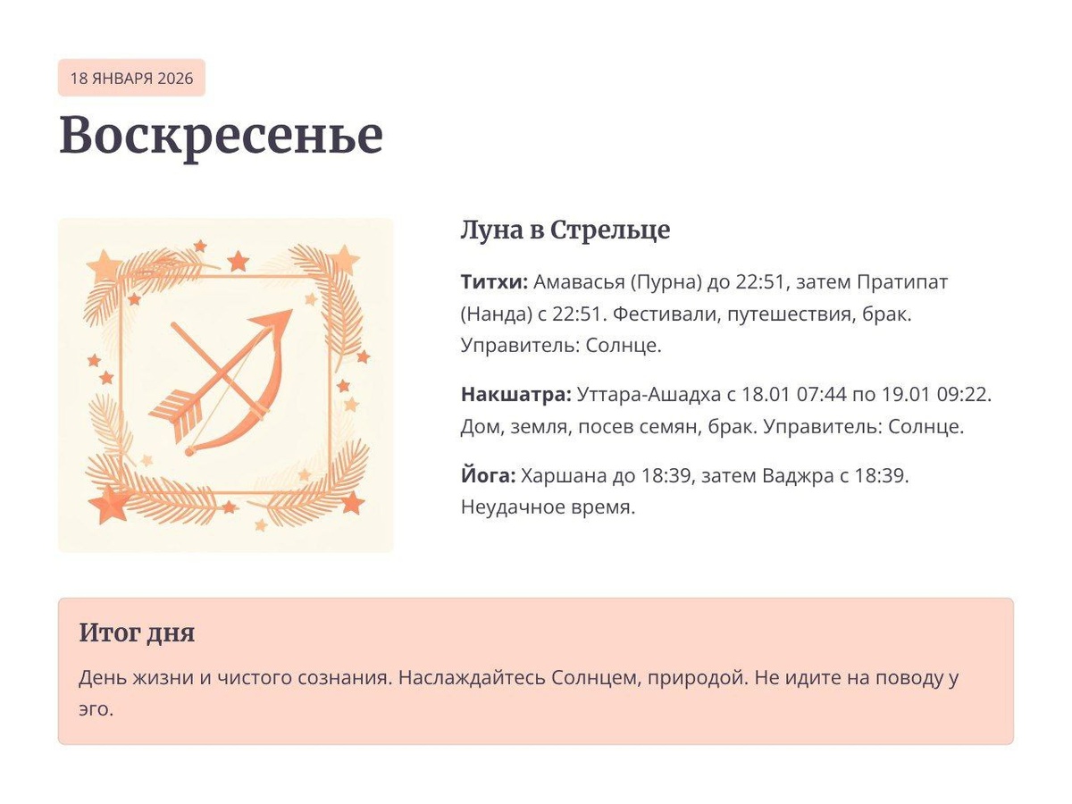 Сегодня — не просто день. Это симфония сакральных совпадений, где вибрации Востока и Запада сливаются в унисон. День Солнца (Равивара), источник жизненной силы, встречает первое новолуние года — Мауна Амавасью, день абсолютной тишины и духовного нуля. А на русской земле наступает Крещенский сочельник — время освящения всех вод. Это не случайность, а знак: великие традиции говорят сегодня на одном языке — языке очищения, тишины и благодати воды. Космическая конфигурация Сегодня Луна совершает переход из огненного Стрельца в дисциплинированного Козерога (в 14:11), где её уже ждёт исключительное собрание пяти планет: Солнце, Венера, Марс и Меркурий. ➠ Ключ дня: Это не время для рывков вперёд. Это момент закладки фундамента под будущие свершения. Силы Козерога требуют серьёзности: сегодняшние внутренние решения, обеты и намерения, выношенные в тишине, станут опорой на весь год. 🌹 Расписание дня: От милости к суровости ❤До 10:16 (Чатушпада карана): Благоприятное время для связи с родо